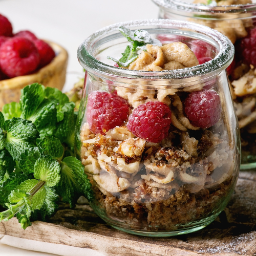 Na dno słoika wsyp pokruszone herbatniki. Następnie dodaj warstwę kremu (np. na bazie mascarpone, jogurtu greckiego lub serka homogenizowanego). Na wierzch ułóż świeże owoce, np. truskawki, maliny, borówki. Możesz dodać listki mięty do dekoracji. Do kosza piknikowego zabierz łyżeczki.